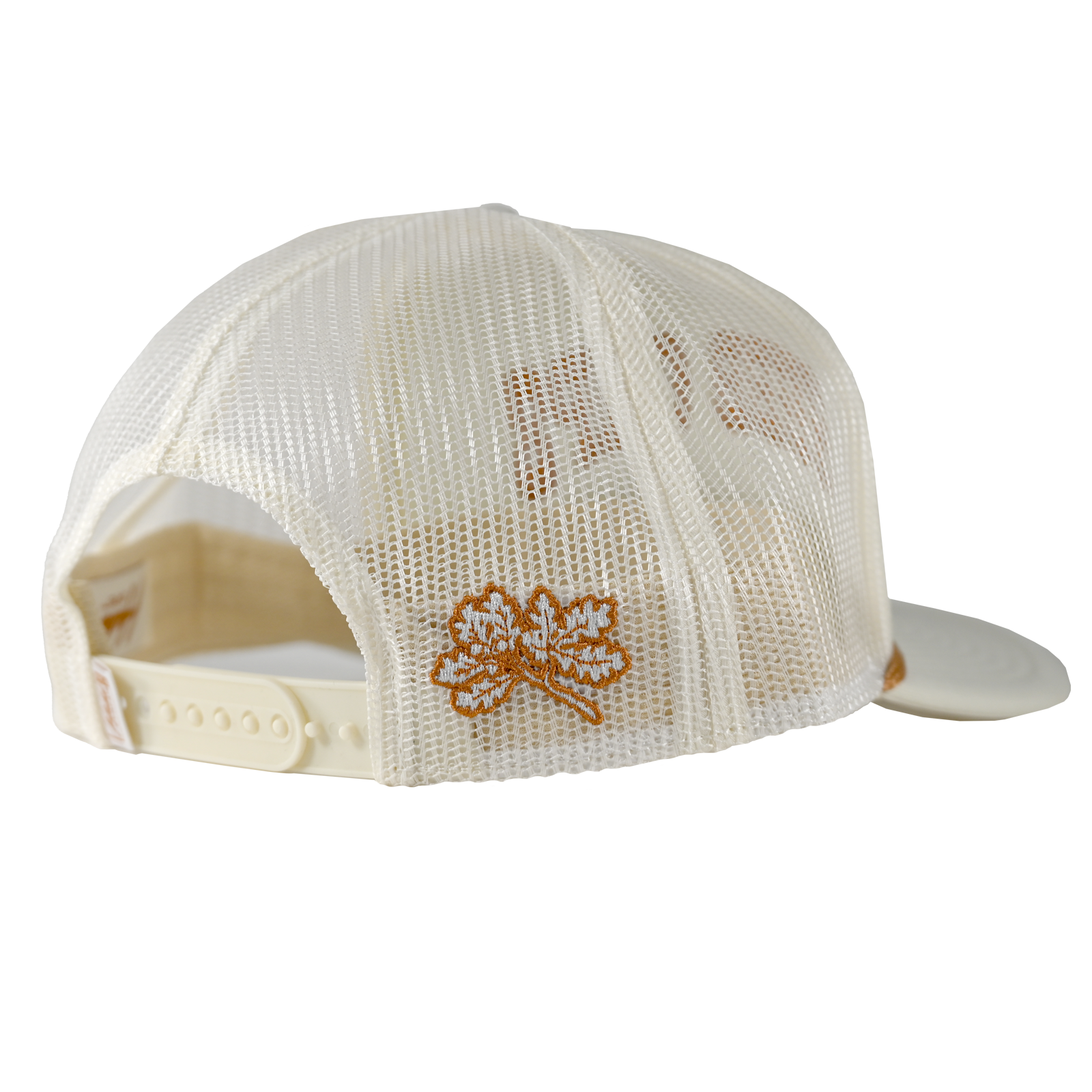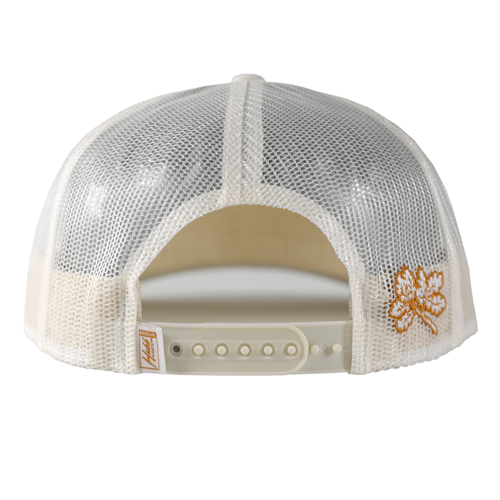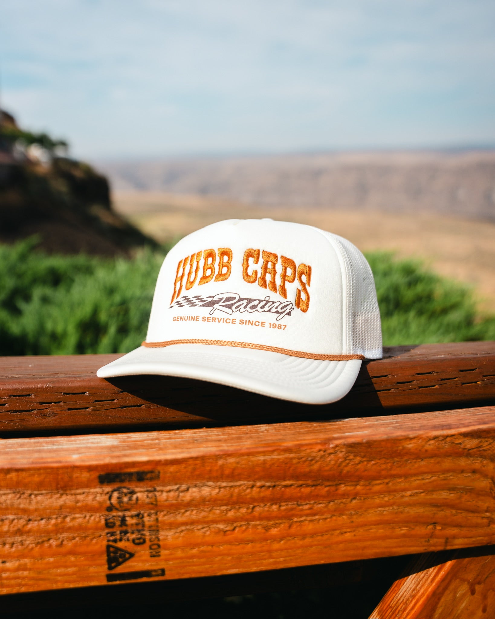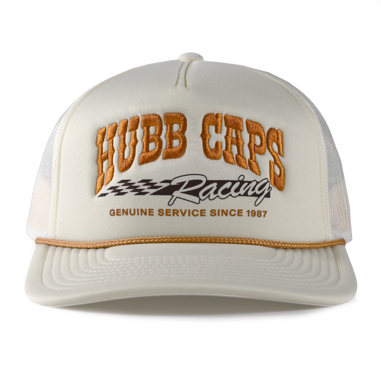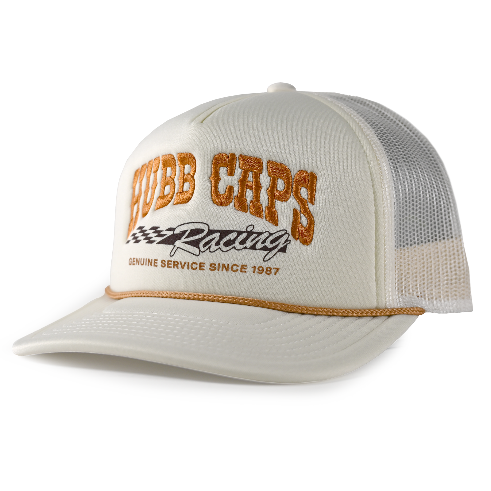Racing Cream Foam Snapback is a custom, cut and sew premium hat constructed from a higher quality mesh fabric and polyester foam material. Decorated with a custom Hubb Caps™ embroidered lettering on the front, an embroidered Georgia live oak tree patch on the back right, a Hubb Caps™ woven label on the inner sweatband, and a Hubb Caps™ woven tag on the snapback. Perfect for heading to the track or wherever life takes you.